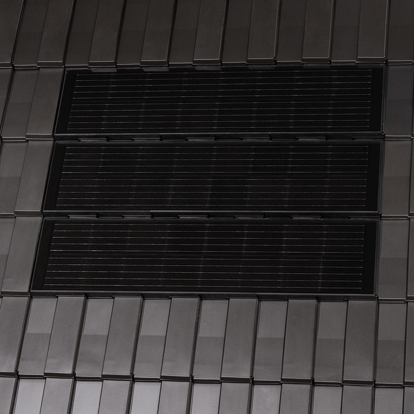 De J160-PV In-dak-module-oplossing is een technisch hoogwaardig PV-systeem dat onopvallend in het dak kan worden geïntegreerd. Het dak wordt zo –ondanks het PV-systeem –een moderne blikvanger en een architectonisch geheel. Een module levert circa 85 watt aan vermogen op en vervangt precies zes dakpannen J160. De module is qua kleur afgestemd op de edel-engobe edelzwart, maar kan in principe met alle J160-kleuren worden gecombineerd.